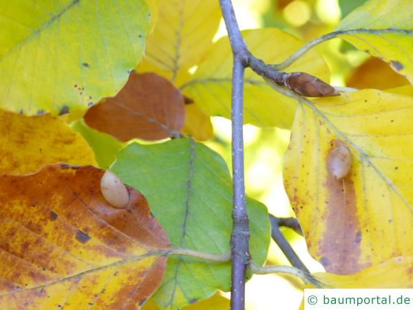 Blattveränderungen auf dem Buchenblatt, die hell, eiförmig, oben zugespitzt sind sowie vom Blatt abstehen, sind auf die Buchengallmücke zurückzuführen. Der Befall, der schon im Sommer beginnt, wenn die Blätter noch grün sind, ist für den Baum ungefährlich. Der wissenschaftliche Name der Gallmücken lautet Cecidomyiidae.