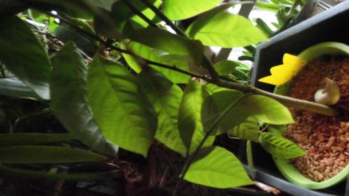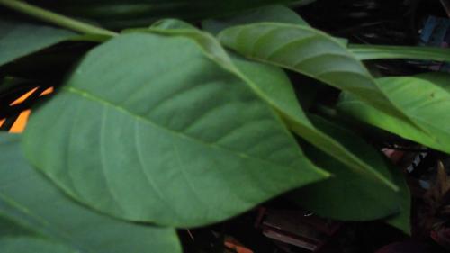 Die Blätter sind irgendwie sanft, so ein "weiches" Grün, fühlen sich, wenn älter an der Oberfläche leicht samtig an aber nicht haarig, Unterseite glatt. Junge Blätter scheinen, wenn man sie im Licht bewegt wie von Sonne vergoldet, also schon grün aber so als würden sie von Abendsonne bestrahlt...Baum ist jetzt schon einige Jahre alt und bildet richtigen Stamm, scheint also Baum-, nicht Strauchfrucht zu sein....