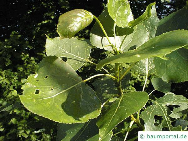 Das Blatt der kanadischen Pappel ist dreieckig bis eiförmig. Es ist dunkelgrün, glänzend und sehr fest. Im Austrieb sind die Blätter rot-bräunlich. Der Blattrand ist gekerbt.